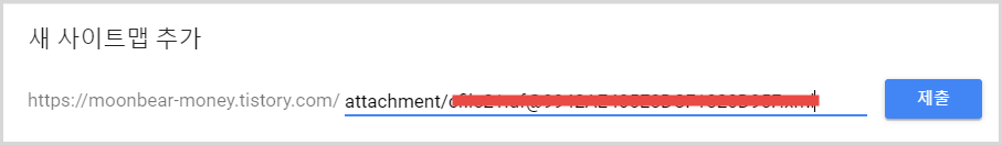 '새 사이트맵 추가'에서 추출한 사이트맵 XML 파일 링크 주소를 'attachment/복사한 링크주소' 형식으로 넣고 제출해 주세요.