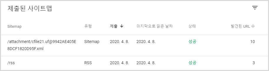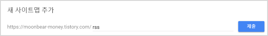 RSS는 구글 서치 콘솔 - 사이트맵 - 새 사이트 추가 부분에서 자신의 블로그 주소 / 바로 뒤에 rss를 적고 제출을 누르시면 됩니다.