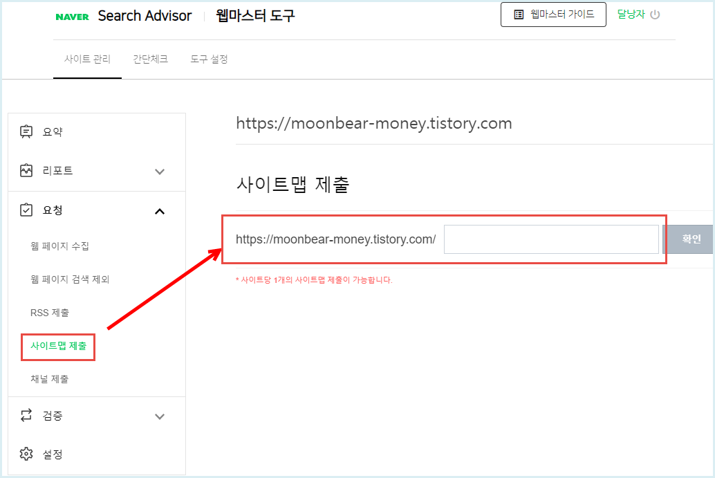 등록된 사이트를 클릭하면 다음과 같이 메뉴 중에 "요청" 부분에서 사이트맵을 제출합니다.