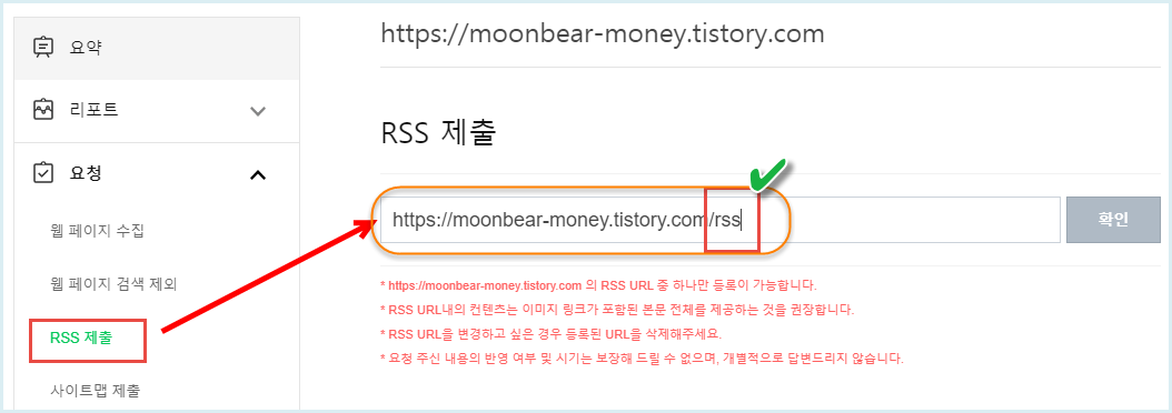 다음과 같이 RSS 제출 메뉴를 클릭 후 자신의 블로그 사이트 주소 뒤에 /rss 만 붙여 주면 됩니다.