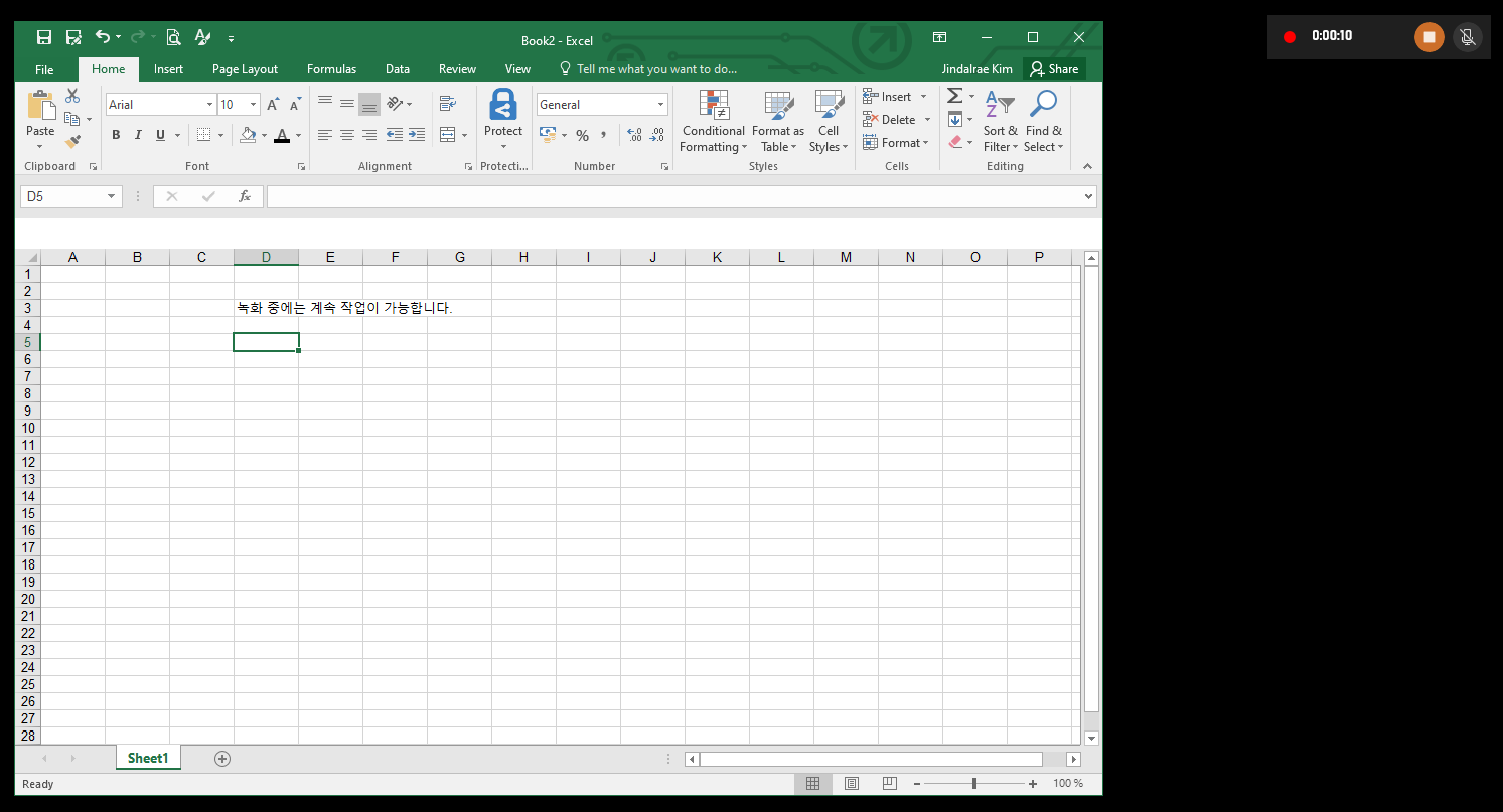 저는 엑셀을 켜두고 화면 녹화 프로그램을 실행해 보았습니다.