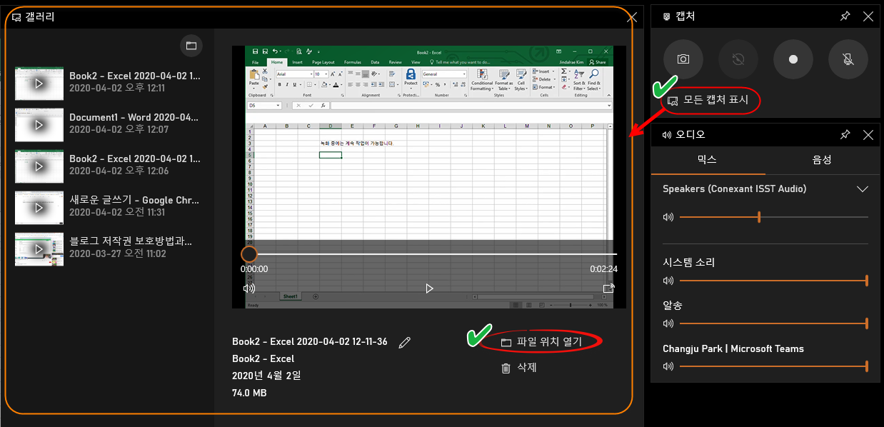 키보드에서 WINDOW+G를 다시 눌러주고 하기 "모든 캡쳐 표시" 버튼을 누르면 녹화 기록들을 쉽게 확인 하실 수 있습니다. :)